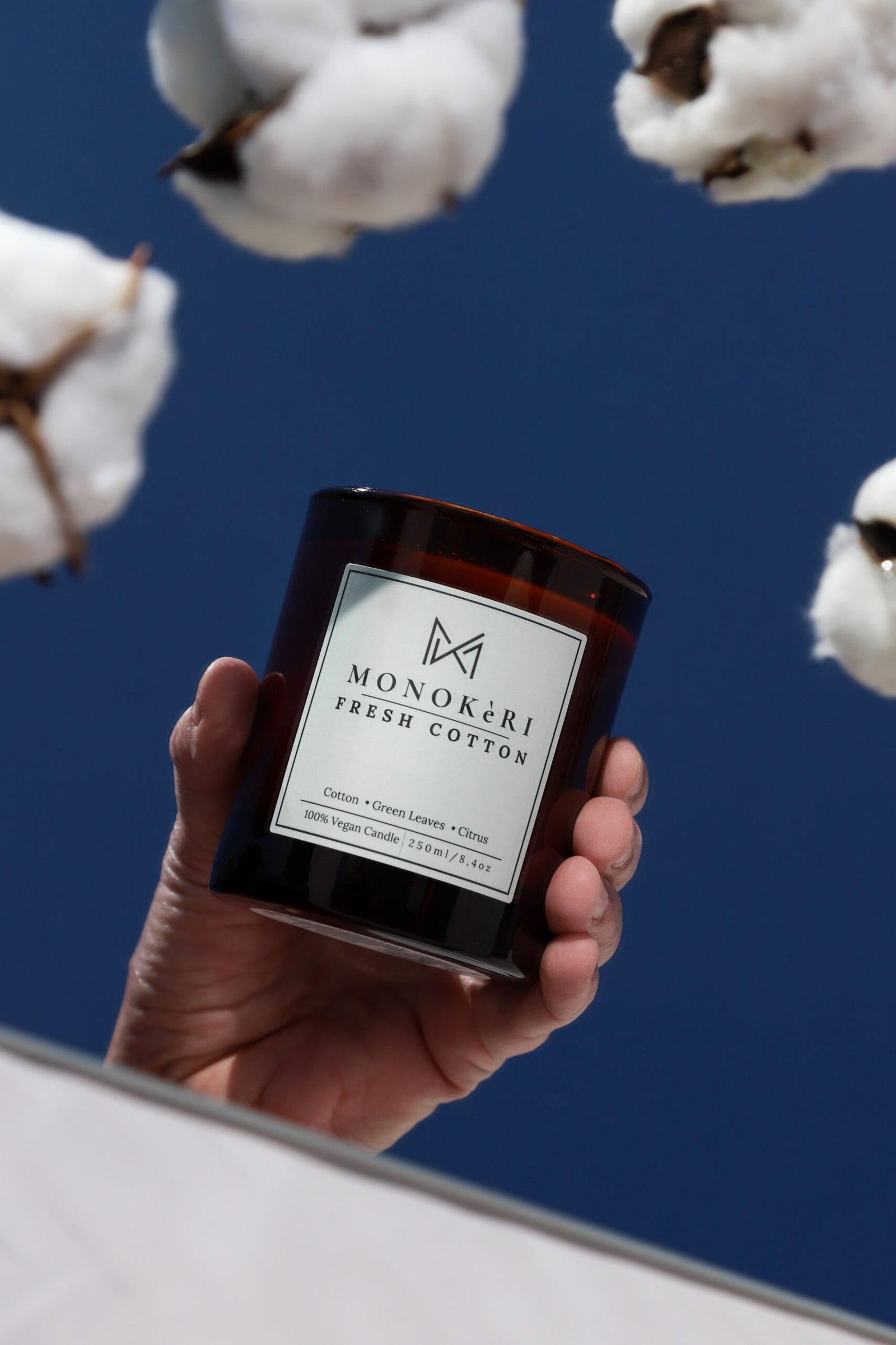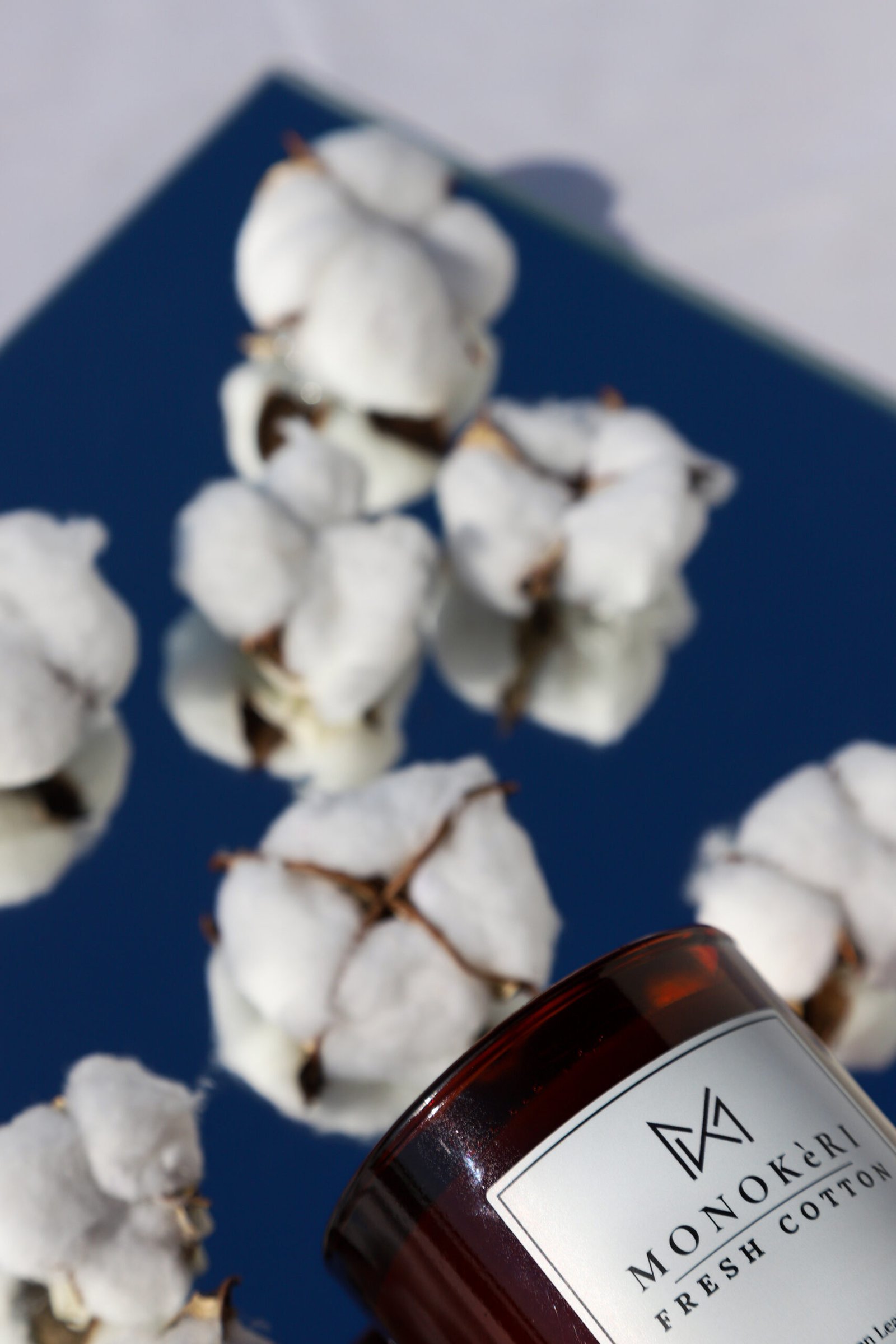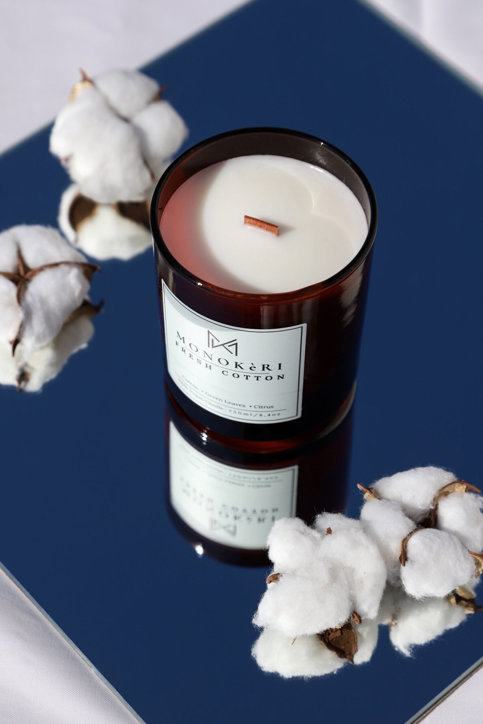 Discover the purity and tranquility of “Fresh Cotton”. This candle evokes the comforting feeling of freshly washed laundry, clean, soft, and full of freshness. A delicate blend of crisp cotton, green leaves, and subtle citrus notes brings a renewed sense of cleanliness that fills your home with softness and calm.