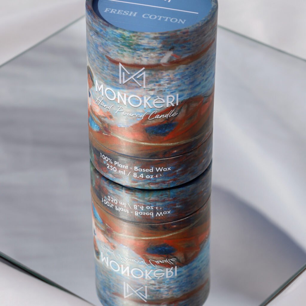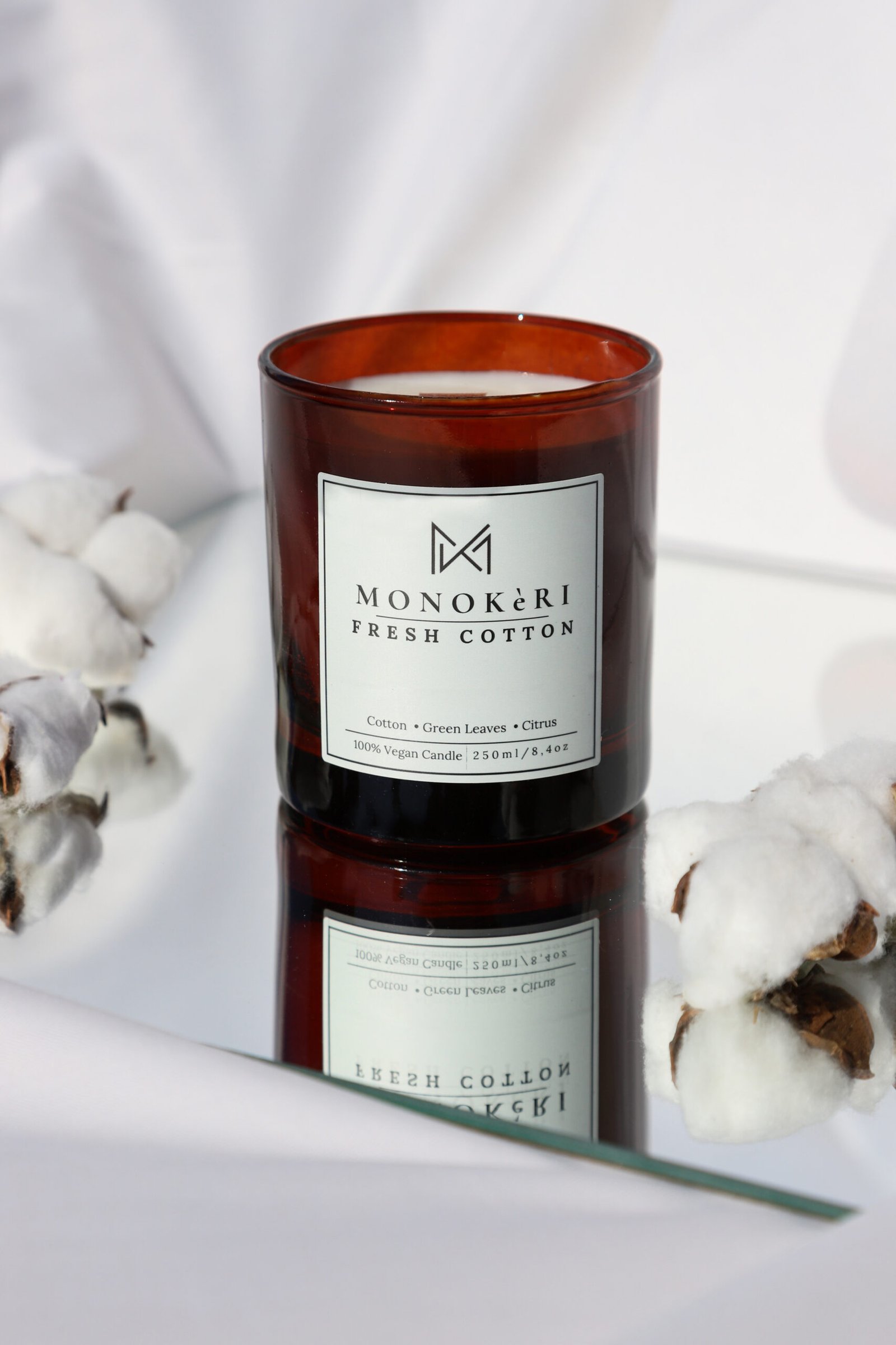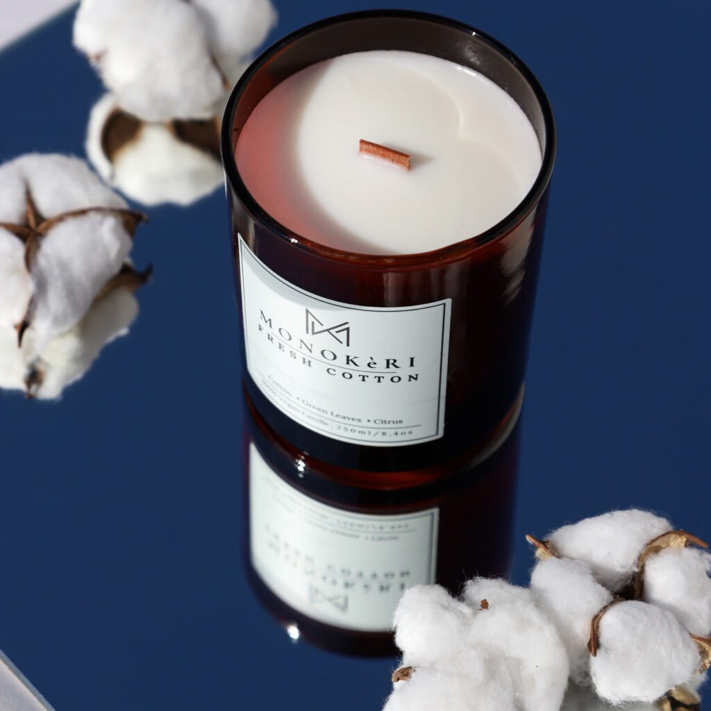 Discover the purity and tranquility of “Fresh Cotton”. This candle evokes the comforting feeling of freshly washed laundry, clean, soft, and full of freshness. A delicate blend of crisp cotton, green leaves, and subtle citrus notes brings a renewed sense of cleanliness that fills your home with softness and calm.