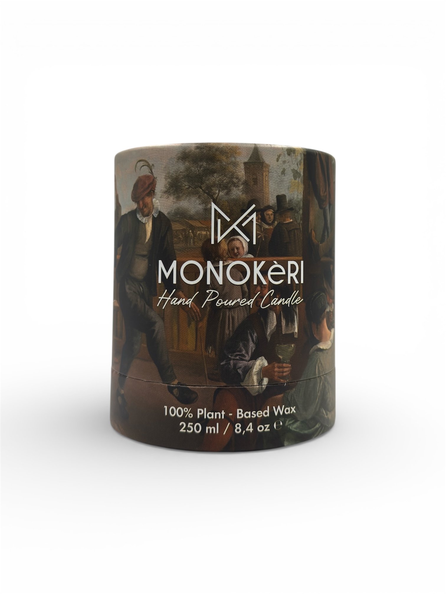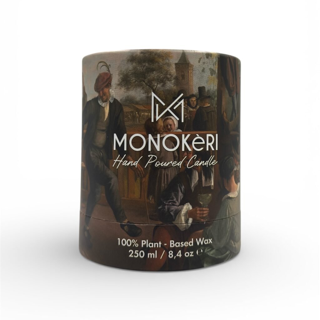 Τη συσκευασία κοσμεί ο πίνακας “The Dancing Couple” (1663) του Jan Steen, όπου μια σκηνή καθημερινής χαράς και ανθρώπινης επαφής αποτυπώνεται μέσα από θερμές αποχρώσεις και ζωντανές εκφράσεις. Η ανεπιτήδευτη οικειότητα και το χαμηλό φως του έργου αντικατοπτρίζουν ιδανικά τον χαρακτήρα του αρώματος — μια γιορτή της απλότητας και της ανθρώπινης συνύπαρξης.